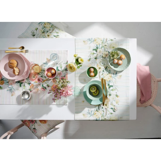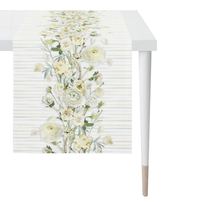 Mit dem Springtime 6402 Tischläufer von Apelt holen Sie sich einen echten Hingucker auf Ihren Esstisch! Aus 100% OEKO-TEX STANDARD 100 zertifizierter Baumwolle hergestellt, ist Springtime 6402 mit einem mittig gesetzten Blütenband aus Ranunkeln und anderen hübschen Frühlingsblühern und dezenten Aquarellstreifen verziert. Egal ob im Alltag oder auf der festlich geschmückten Tafel: Die Apelt Springtime 6402 Tischwäsche passt einfach zu jedem Anlass, lässt sich hervorragend mit schlicht weißem oder trendig buntem Porzellan kombinieren und kann problemlos im Feinwaschgang gereinigt werden. Und wenn Sie es gerne perfekt mögen: Hier im Shop bietet AMBIENDO Ihnen – passend zu dem Apelt Tischläufer – auch die Springtime 6402 Kissenhülle mit Reißverschluss an. Lassen Sie sich von der hohen Qualität und dem tollen Look begeistern und verwandeln Ihren Esstisch in einen echten Eyecatcher!