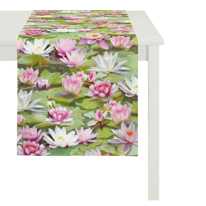 Internationale Trends und zeitgemäßes Design bestimmen die farbenprächtigen Kollektionen von Apelt. Sie umfassen Jacquard- und Transparentstoffe fürs Fenster, wunderschöne Tischwäsche, Sets, Servietten, Kissen in wunderschönen Designs und Farben. Mit Apelt können Sie sich modern und stilvoll einrichten. Der geschmackvolle Tischläufer Summer Garden 9587 von Apelt sorgt für einen stilvollen Eyecatcher auf jedem Tisch! Das anmutige Design beeindruckt durch die wunderschönen Seerosen in brillanter Farbqualität. Dabei kommt der hochwertige Digitaldruck auf dem feinem Material besonders gut zur Geltung. Der Läufer besteht aus 100% hochwertiger Baumwolle und ist pflegeleicht. Mit dem atemberaubenden Tischläufer Summer Garden 9587 von Apelt sorgen Sie für ein farbenprächtiges Ambiente in Ihrem Zuhause. Wir bieten Ihnen aus dieser exklusiven Serie weitere Tischaufleger in unterschiedlichen Größen an. Lassen Sie sich von diesem exquisiten Wohn-Accessoire begeistern!