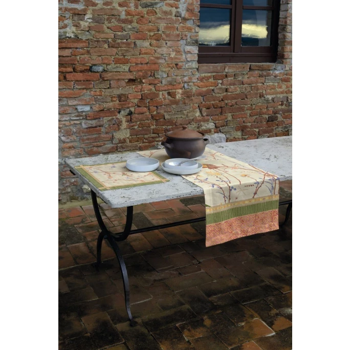 Überzeugen Sie sich von dem tollen Dessin des Tischläufers Fong von BASSETTI und setzen Sie ein echtes Statement auf Ihrem Esstisch, egal ob draußen oder drinnen. Das verspielte Dessin mit hübschen Ranken und einem Vogelmotiv kommt in einer stimmigen Farbkombination und wird durch eine Bordüre eingefasst. Egal ob zum Frühstückstisch oder für einen feierlichen Anlass, mit diesem vielseitig einsetzbaren Set werden Sie lange Ihre Freude haben. Kombinieren Sie dazu das passende Tischset oder lassen Sie den schönen Läufer für sich alleine wirken.